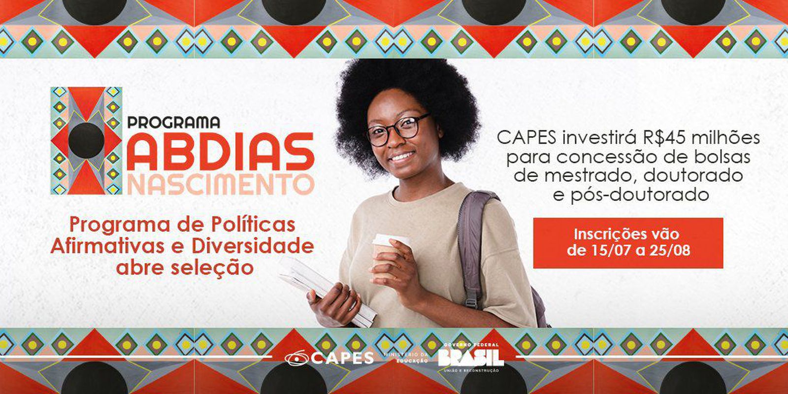 Essa política afirmativa e de diversidade é uma das ações do Programa de Desenvolvimento Acadêmico Abdias Nascimento, recriado pelo Ministério da Educação (MEC) e pela Capes em junho deste ano [